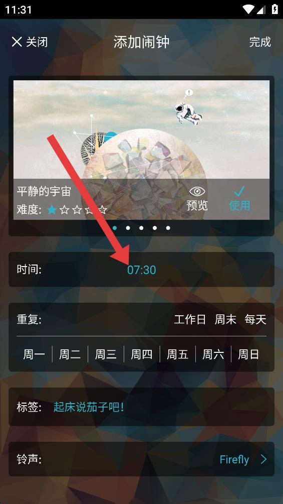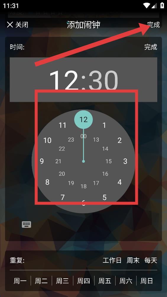 4、設(shè)置想要的鬧鐘時(shí)間,設(shè)置好后點(diǎn)擊完成,即可成功設(shè)置鬧鐘。