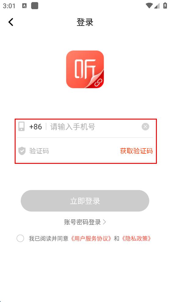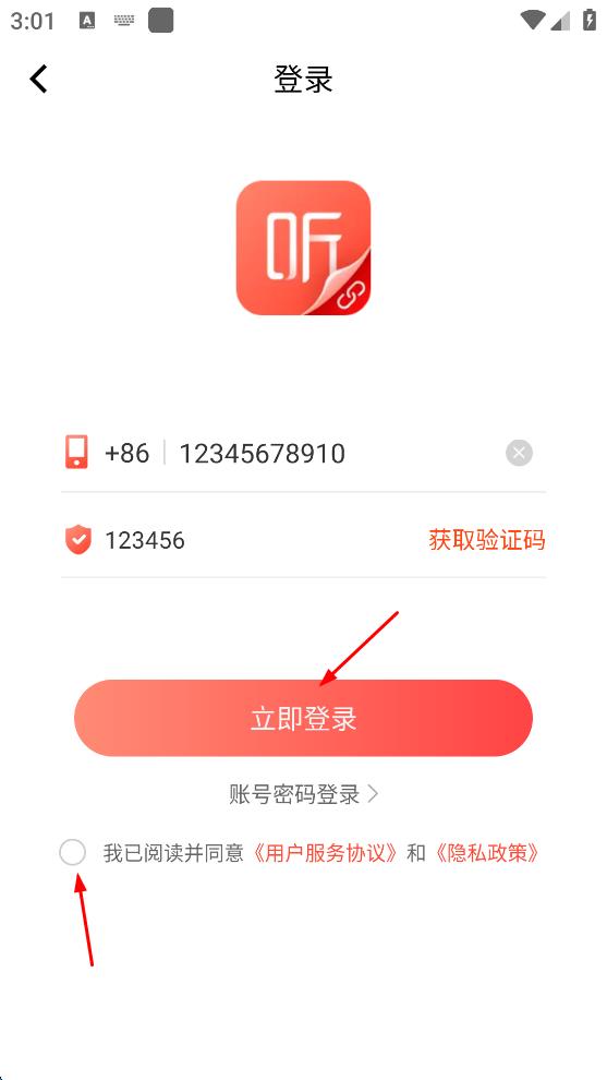 4、輸入好手機(jī)號和驗(yàn)證碼后,勾選我已閱讀并同意用戶服務(wù)協(xié)議和隱私政策,最后點(diǎn)擊“立即登錄”按鈕,完成聽書軟件的手機(jī)號登錄操作。