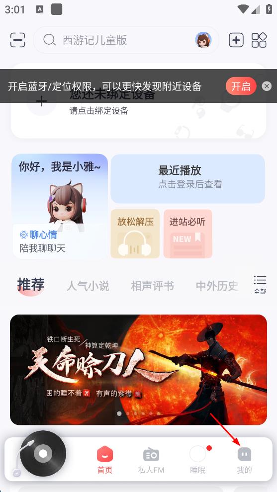 1、打開聽書軟件,進(jìn)入首頁后,點(diǎn)擊右下角“我的”,進(jìn)入個(gè)人頁面。