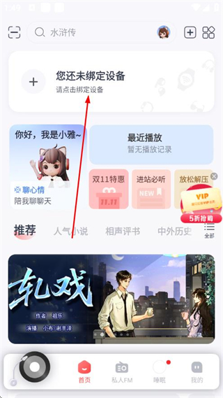 1、打開喜馬拉雅穿戴APP,在首頁點(diǎn)擊您還未綁定設(shè)備 請點(diǎn)擊綁定設(shè)備區(qū)域。