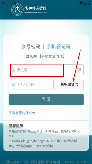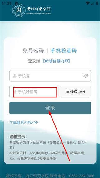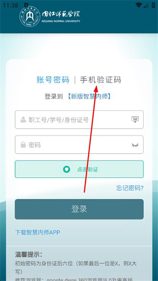 1、打開智慧內(nèi)師登錄頁面,點擊手機驗證碼選項。