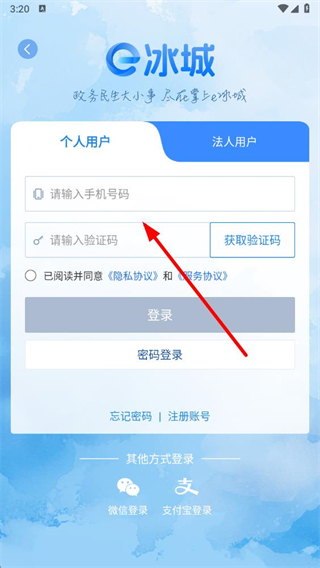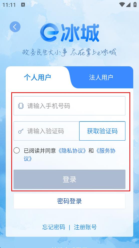 4、在登錄選擇界面,選擇個人用戶,輸入手機號碼,獲取并輸入驗證碼,勾選已閱讀并同意相關協(xié)議,點擊登錄即可。