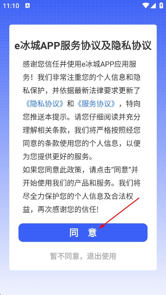1、打開e冰城,在彈出的服務協(xié)議及隱私協(xié)議頁面,點擊同意,進入e冰城首頁。