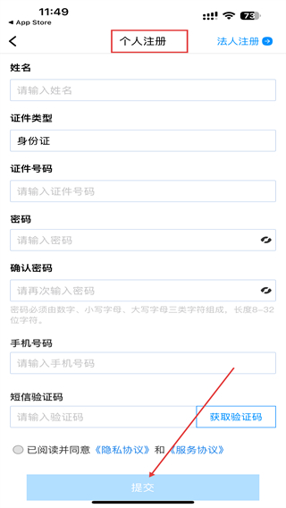 4、進入個人注冊的頁面內,輸入信息后點擊提交即可。
