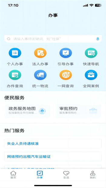 7、辦事大廳、地圖服務、個企通辦、快速辦理、一網(wǎng)查詢、智能問答、全網(wǎng)案例、事項清單等快捷功能,快速開啟辦事服務與查詢等功能,方便用戶操作;