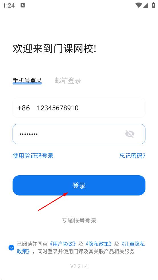 4、勾選已閱讀并同意相關(guān)協(xié)議和政策,點擊登錄,即可完成門課網(wǎng)校的登錄。