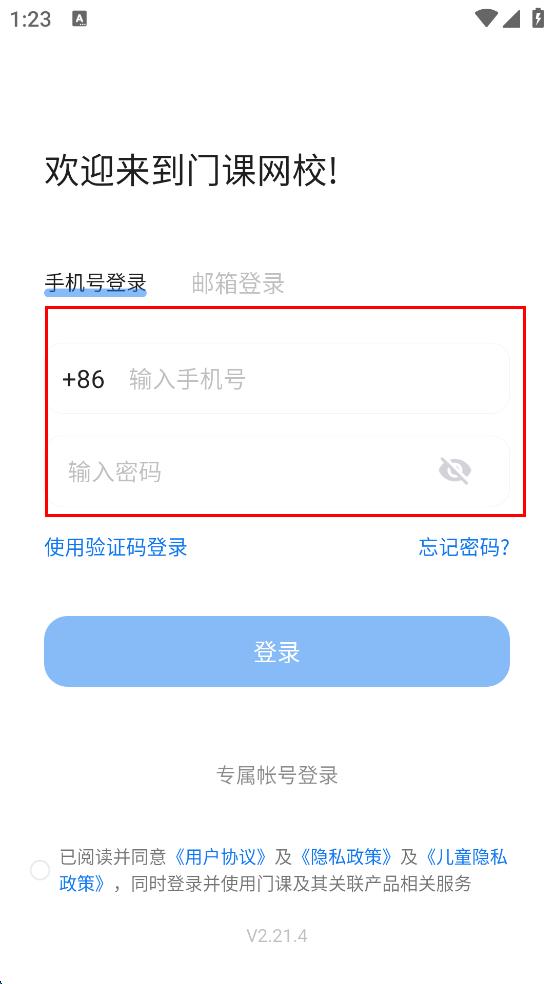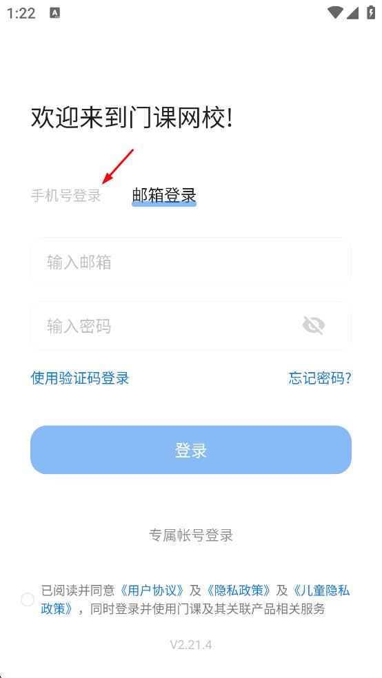 2、在門課網(wǎng)校登錄頁面,點擊手機號登錄,進入手機號和密碼輸入頁面。