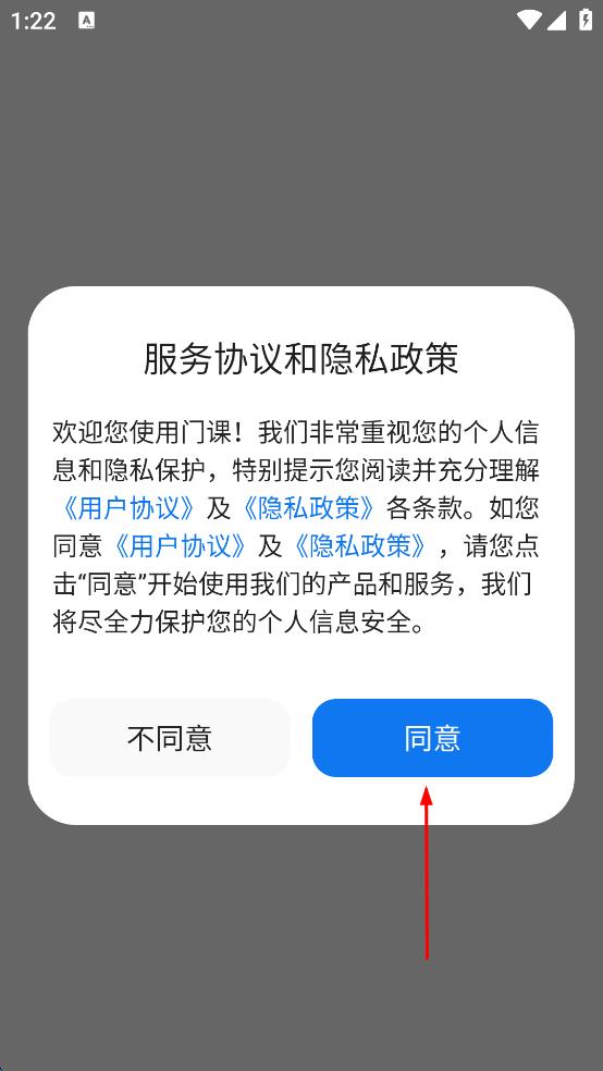 1、打開門課,在彈出的服務(wù)協(xié)議和隱私政策頁面,點擊同意,進入門課網(wǎng)校登錄頁面。