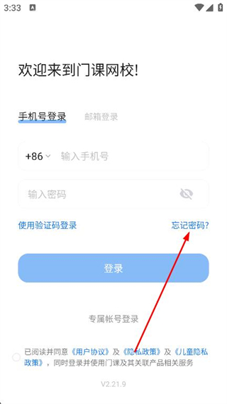 1、打開門課APP,在登錄頁面點擊忘記密碼選項。