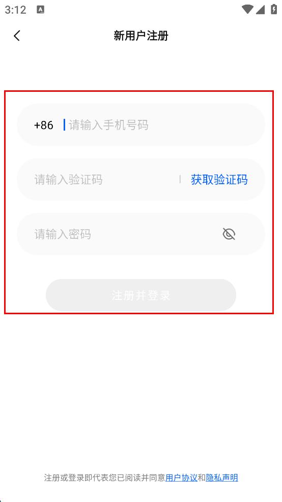 3、在新用戶注冊(cè)界面輸入手機(jī)號(hào)碼、驗(yàn)證碼、密碼,點(diǎn)擊注冊(cè)并登錄,完成賬號(hào)注冊(cè)。
