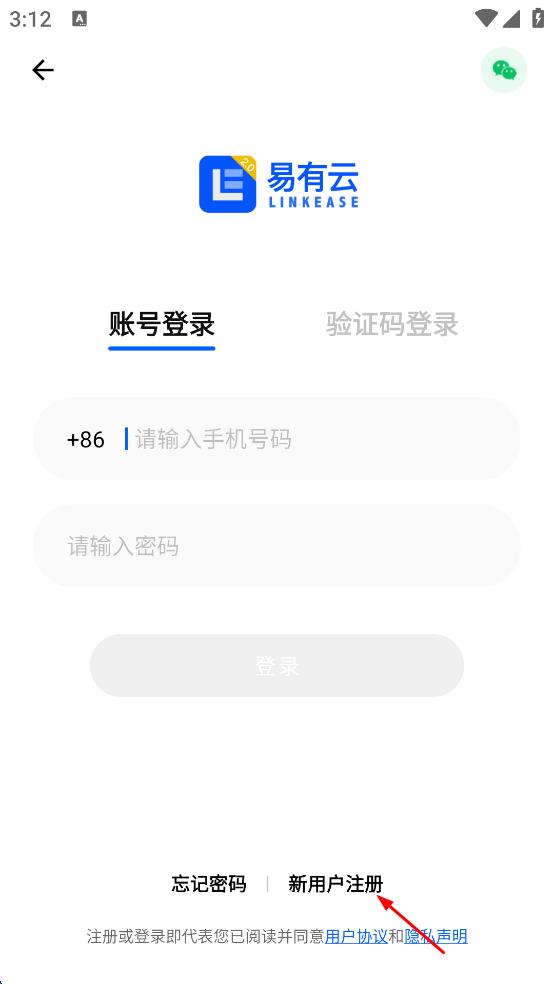 2、在個(gè)人頁(yè)面點(diǎn)擊昵稱未登錄,進(jìn)入賬號(hào)登錄界面,若沒(méi)有賬號(hào),點(diǎn)擊新用戶注冊(cè)。