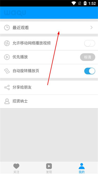 2、進(jìn)入我的頁(yè)面,找到并點(diǎn)擊最近觀看選項(xiàng)。