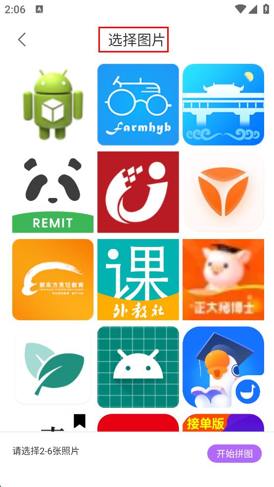 4、在選擇圖片頁面,挑選2 - 6張照片,選好后點(diǎn)擊“開始拼圖”,即可進(jìn)行拼圖操作。