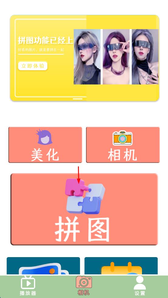 3、在相機(jī)功能頁面,找到“拼圖”按鈕,點(diǎn)擊該按鈕,進(jìn)入選擇圖片頁面。