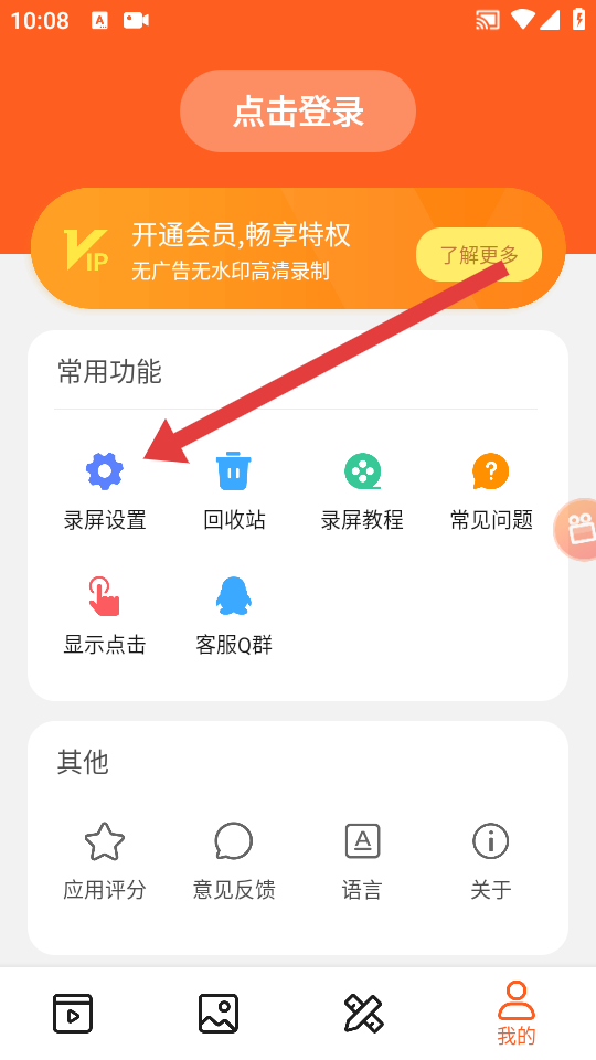 2、在個人頁面的常用功能區(qū)域,點(diǎn)擊錄屏設(shè)置選項(xiàng),進(jìn)入錄屏設(shè)置頁面。