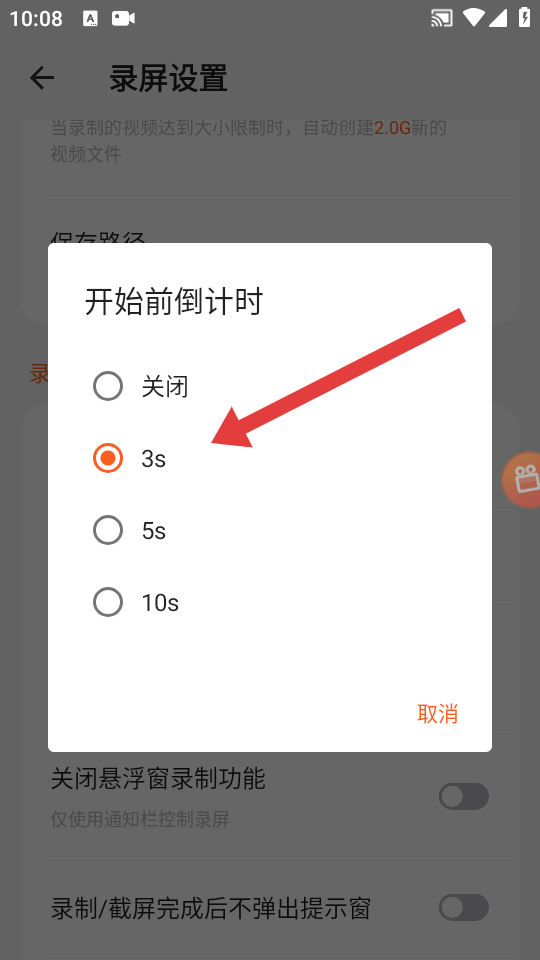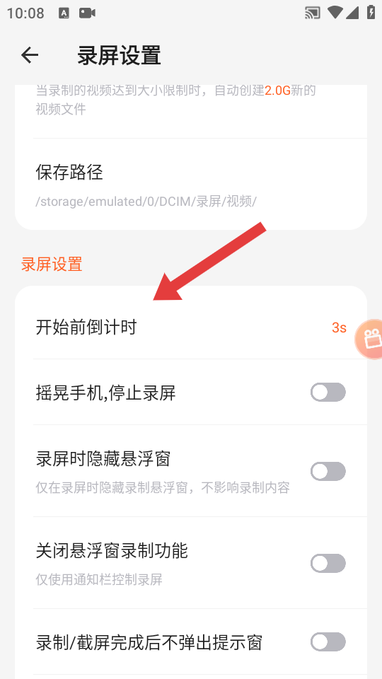 3、在錄屏設(shè)置頁面,點(diǎn)擊開始前倒計(jì)時選項(xiàng),彈出倒計(jì)時時長選擇框。