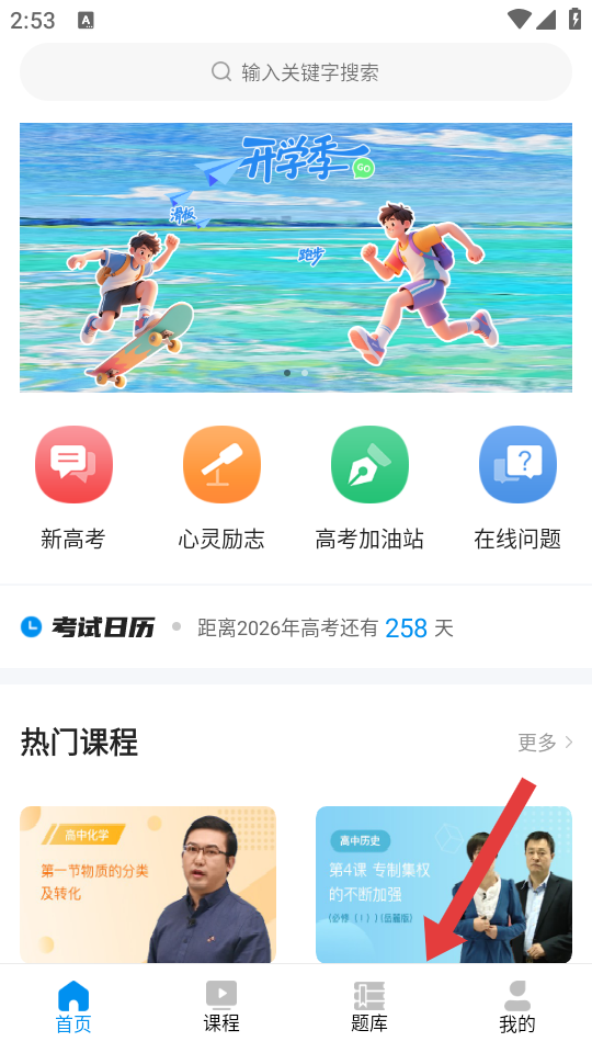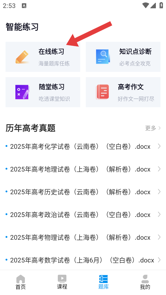 1、在匯高考首頁(yè)點(diǎn)擊題庫(kù),進(jìn)入題庫(kù)功能的頁(yè)面,可查看真題板塊。