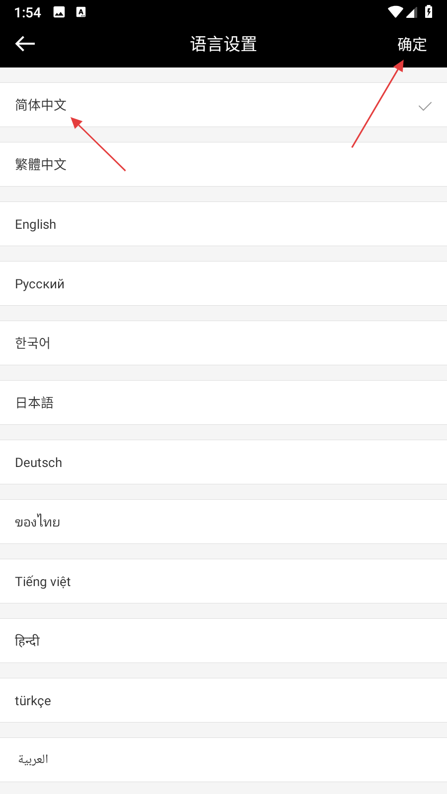 4、在語言設置頁面,選擇需要的語言,然后點擊右上角的確定按鈕,完成語言更改。