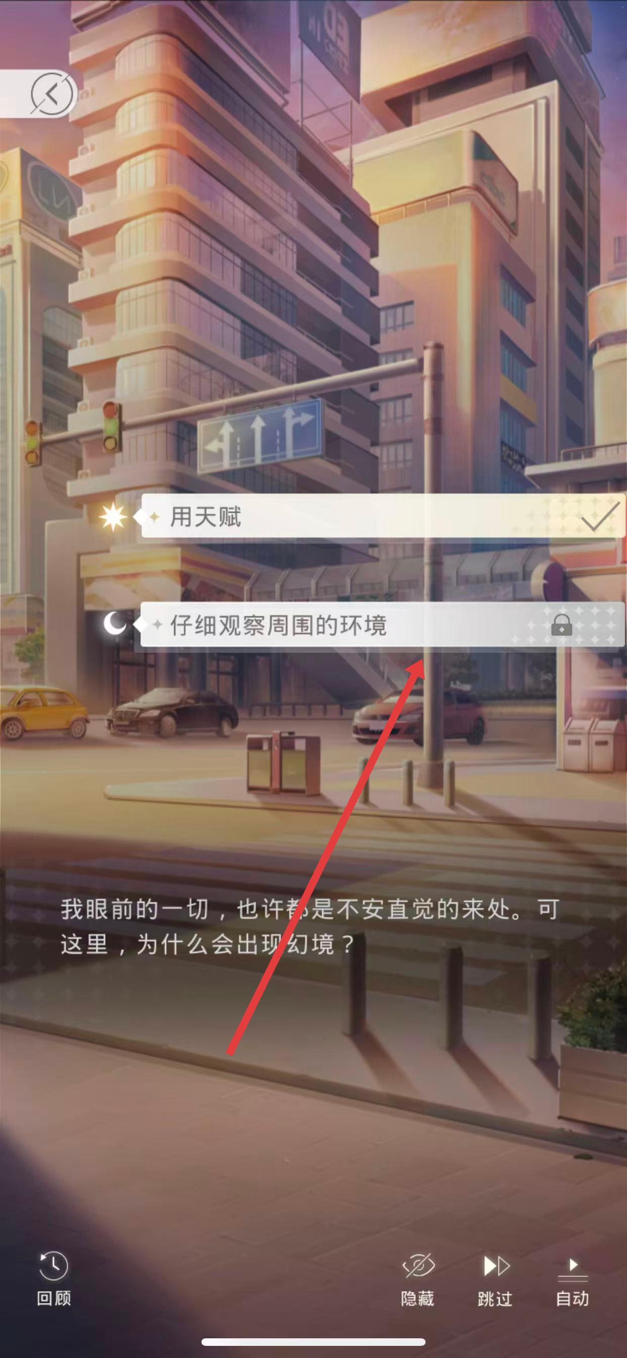 3、進(jìn)入關(guān)卡劇情后,推進(jìn)到出現(xiàn)光夜抉擇選項(xiàng)的界面,再次選擇另一個(gè)劇情分支選項(xiàng),以此重置該關(guān)卡劇情選擇。