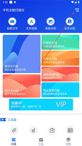 1、打開全能手機(jī)掃描儀應(yīng)用,點(diǎn)擊頁面右上角的三條橫線菜單按鈕。