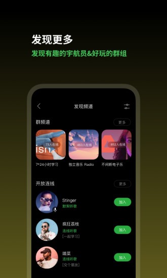 space設(shè)定為一個(gè)共享耳機(jī)的虛擬宇宙,你可以像宇航員一樣連線不同的人,聽聽對(duì)方聽的歌、說的話。你如果自己也愿意,也可以開放連線,等待接入。