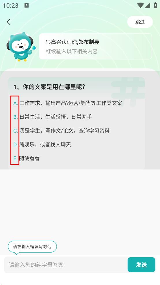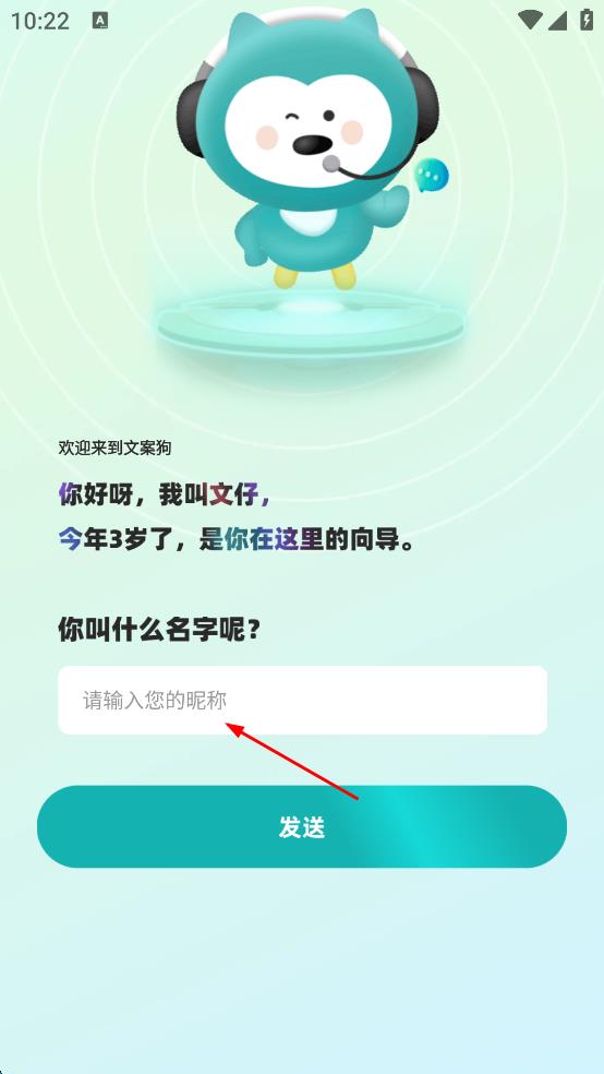 2、進(jìn)入文案狗歡迎界面后,在“請輸入您的昵稱”輸入框中輸入自己的昵稱,然后點(diǎn)擊“發(fā)送”按鈕。