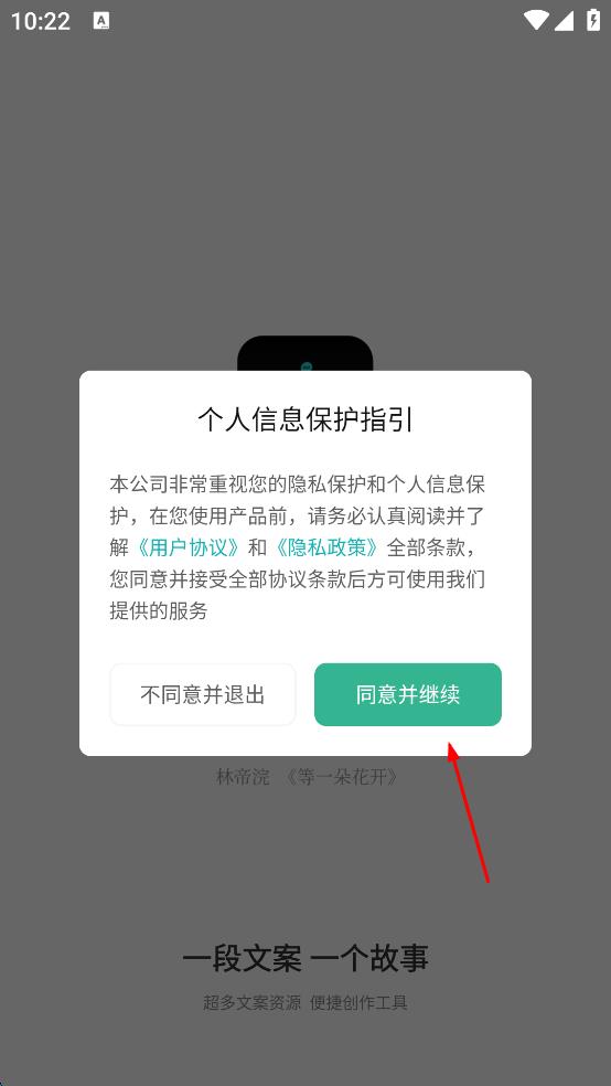 1、打開文案狗app,在彈出的個(gè)人信息保護(hù)指引界面,找到“同意并繼續(xù)”按鈕,點(diǎn)擊該按鈕。