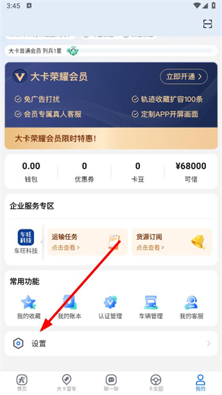 1、打開車旺大卡app,在我的頁面點擊設(shè)置選項,進入設(shè)置頁面。