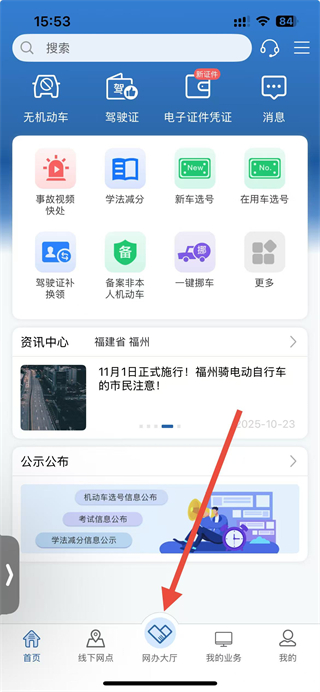 1、在交管12123主界面,點(diǎn)擊底部的網(wǎng)辦大廳選項(xiàng),進(jìn)入網(wǎng)辦業(yè)務(wù)的功能集合頁面。