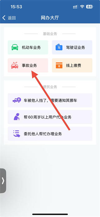 2、在網(wǎng)辦大廳的基礎(chǔ)業(yè)務(wù)區(qū)域,點(diǎn)擊事故業(yè)務(wù)選項(xiàng),進(jìn)入事故相關(guān)的業(yè)務(wù)辦理界面。