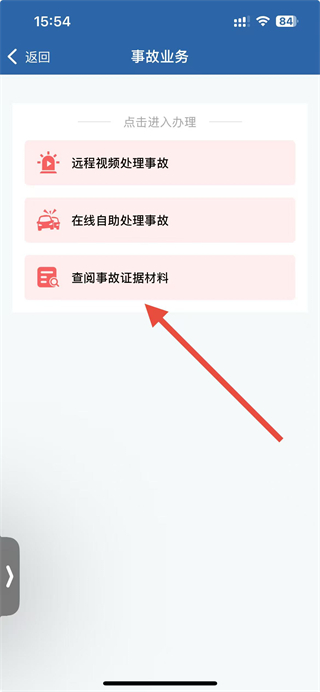 3、在事故業(yè)務(wù)頁面,點(diǎn)擊查閱事故證據(jù)材料選項(xiàng),進(jìn)入事故證據(jù)材料的查閱操作界面。