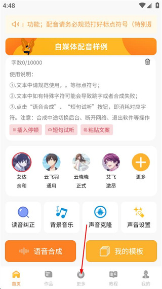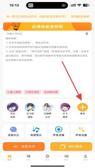 1、打開九錘配音的應(yīng)用軟件,在首頁內(nèi)點擊配音區(qū)域右側(cè)更多的按鈕。