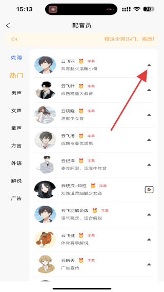 2、進(jìn)入到配音員的頁面內(nèi),點擊配音右側(cè)的圖標(biāo)按鈕。