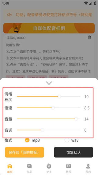 4、在配音參數(shù)調(diào)整界面調(diào)整情緒程度、語速、音量、音調(diào)等參數(shù),完成配音設(shè)置。