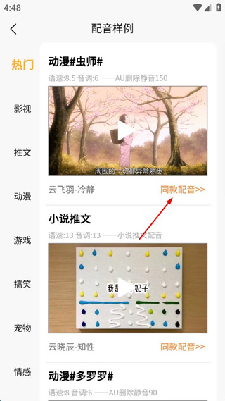 3、在配音樣例頁面選擇“同款配音”選項,進(jìn)入配音參數(shù)調(diào)整界面。