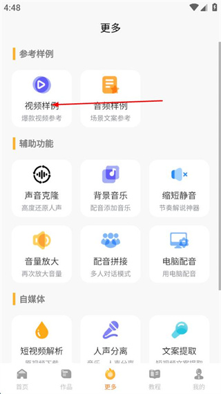 2、在更多功能頁面點擊“音頻樣例”選項,進(jìn)入配音樣例頁面。