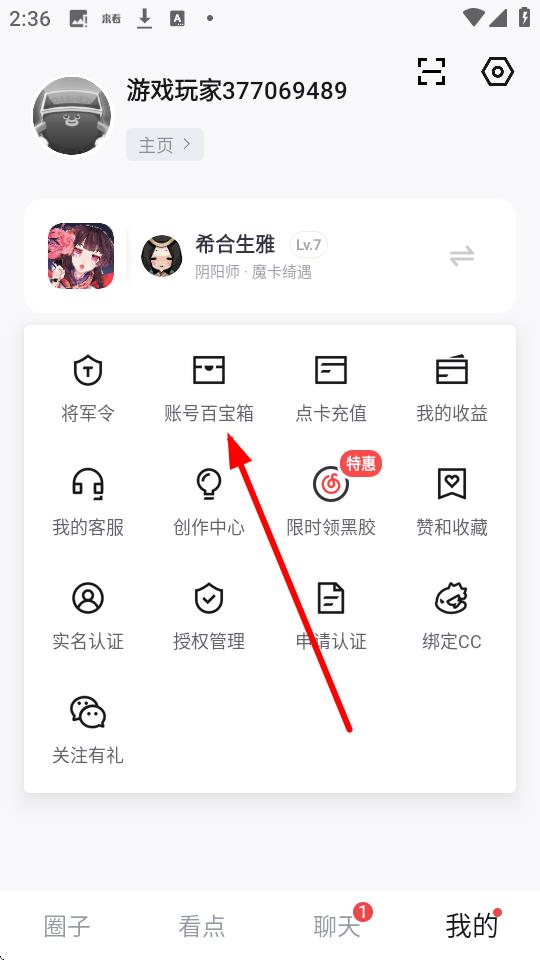 2、在我的頁(yè)面中,找到并點(diǎn)擊賬號(hào)百寶箱功能按鈕。