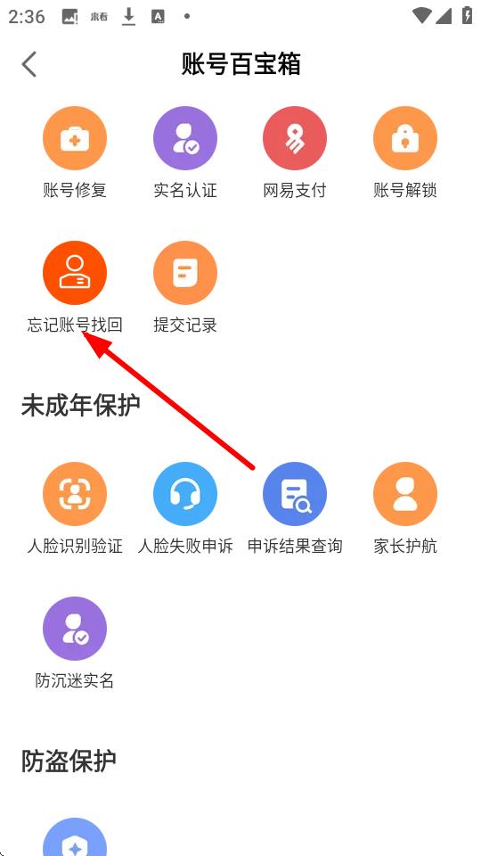 3、進(jìn)入賬號(hào)百寶箱頁(yè)面后,點(diǎn)擊忘記賬號(hào)找回選項(xiàng)。