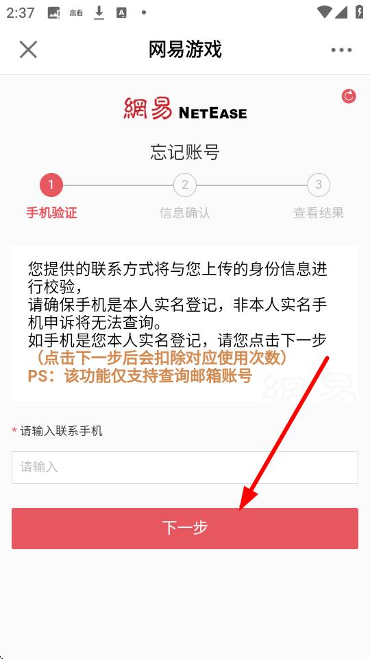 4、在忘記賬號(hào)頁(yè)面,按提示輸入聯(lián)系手機(jī)后點(diǎn)擊下一步,并根據(jù)后續(xù)指引操作找回賬號(hào)。