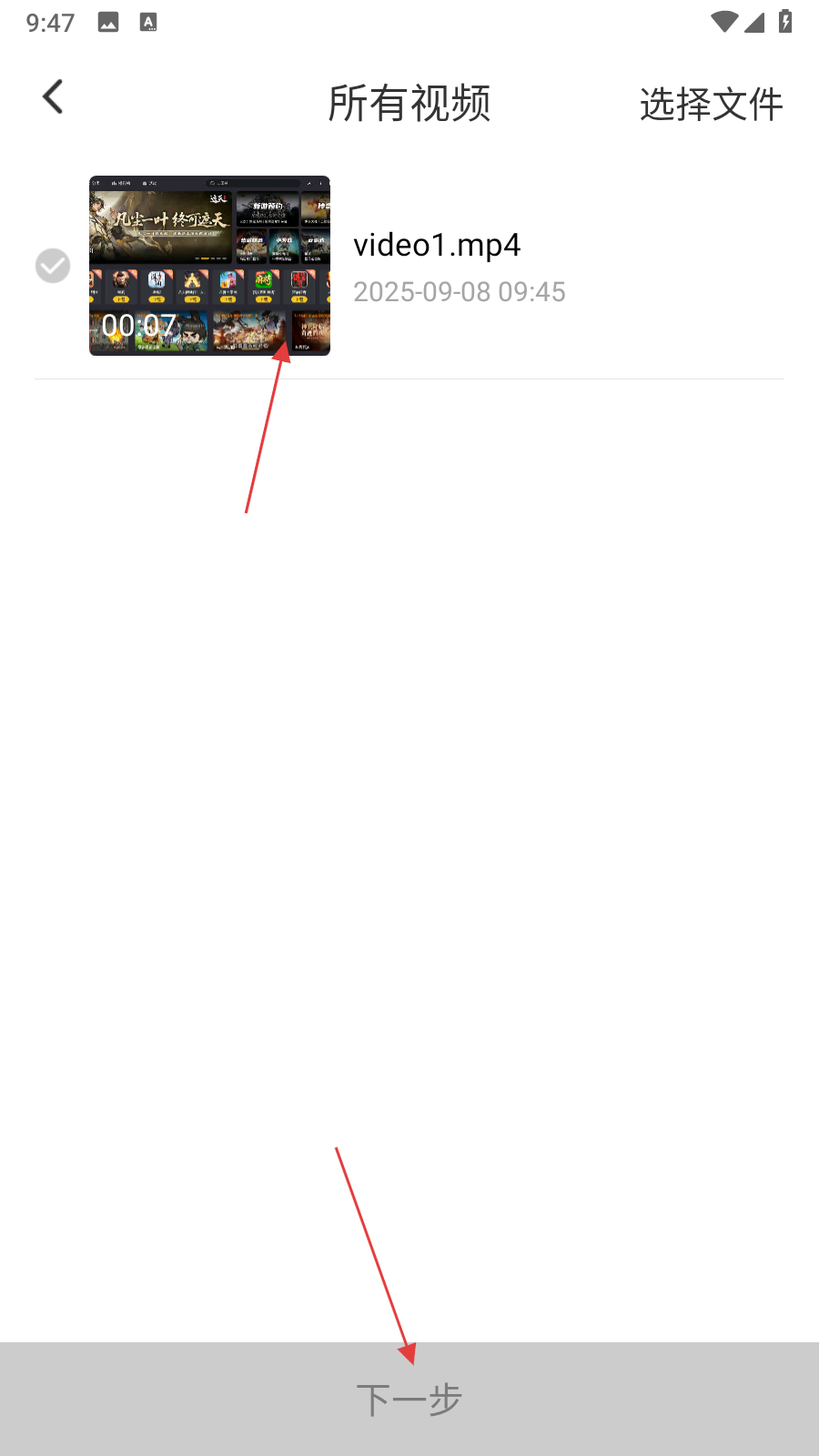 2、在視頻選擇頁面中,找到并點擊需要轉(zhuǎn)換格式的視頻,然后點擊頁面底部的下一步按鈕。