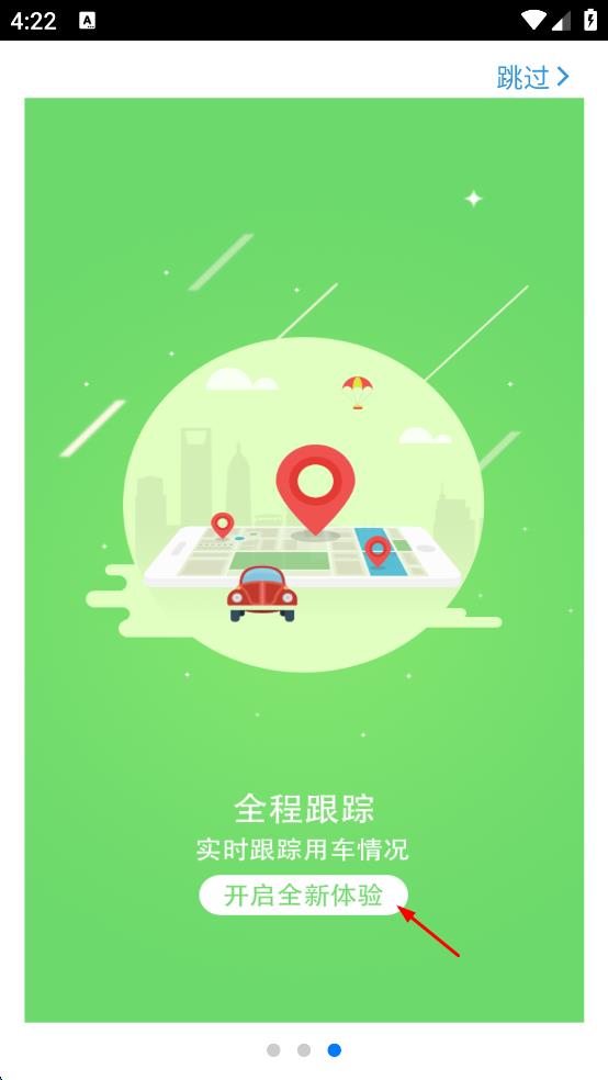 1、打開(kāi)公務(wù)用車(chē)APP,會(huì)看到“全程跟蹤 實(shí)時(shí)跟蹤用車(chē)情況”的引導(dǎo)頁(yè)面,點(diǎn)擊“開(kāi)啟全新體驗(yàn)”按鈕,進(jìn)入APP主界面。