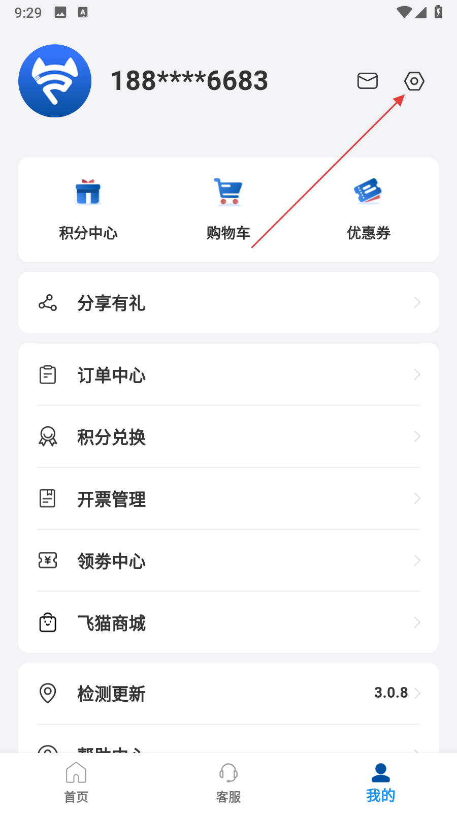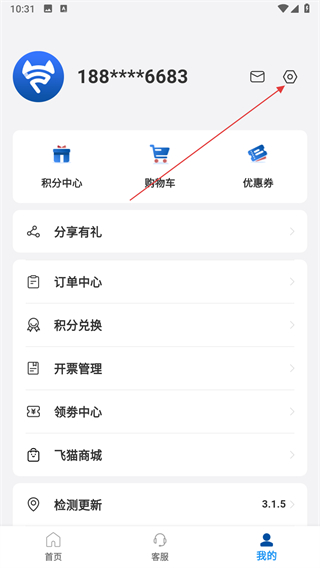 1、打開(kāi)飛貓管家應(yīng)用,在首頁(yè)點(diǎn)擊底部我的選項(xiàng),進(jìn)入個(gè)人頁(yè)面。