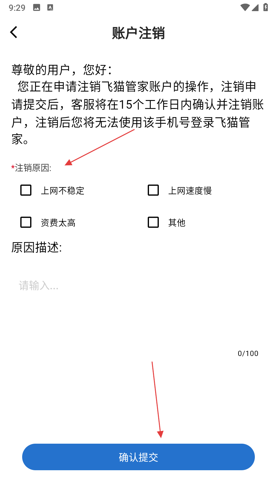 4、在賬戶注銷(xiāo)頁(yè)面,選擇注銷(xiāo)原因,若有其他原因可在原因描述欄輸入,之后點(diǎn)擊確認(rèn)提交,提交后客服會(huì)在15個(gè)工作日內(nèi)確認(rèn)并注銷(xiāo)賬戶。
