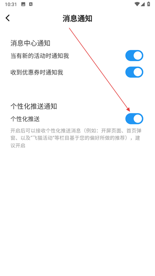 4、點(diǎn)擊個(gè)性化推送的開(kāi)關(guān)按鈕即可。