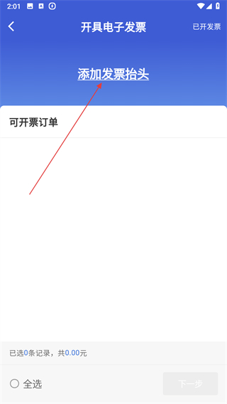 2、進(jìn)開(kāi)具電子發(fā)票界面,點(diǎn)添加發(fā)票抬頭,跳轉(zhuǎn)至我的發(fā)票抬頭頁(yè)面。
