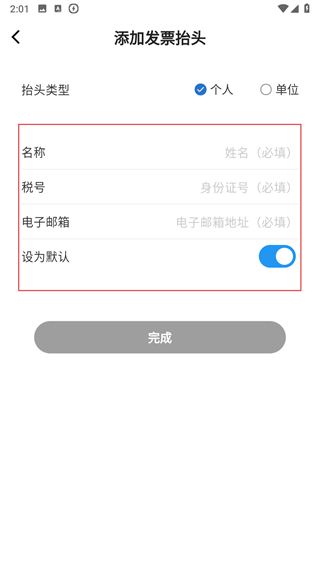 4、選個(gè)人類(lèi)型,填名稱稅號(hào)電子郵箱,名稱等信息,點(diǎn)完成按鈕即可保存。
