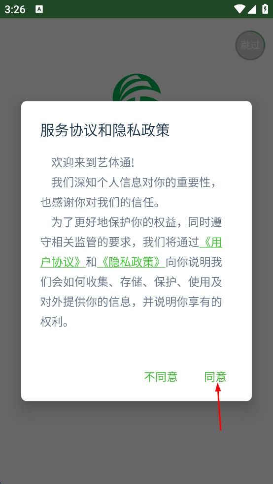 1、打開(kāi)藝體通,出現(xiàn)服務(wù)協(xié)議和隱私政策提示框,點(diǎn)擊同意。