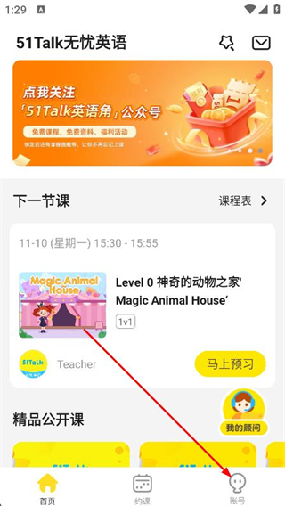 1、打開51Talk APP,點擊底部導航欄賬號選項。
