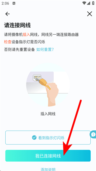 4.將攝像機插入網(wǎng)線,網(wǎng)線另一端連接路由器,確認設(shè)備指示燈閃爍后,點擊我已連接網(wǎng)線按鈕,按照后續(xù)提示完成設(shè)備添加操作。