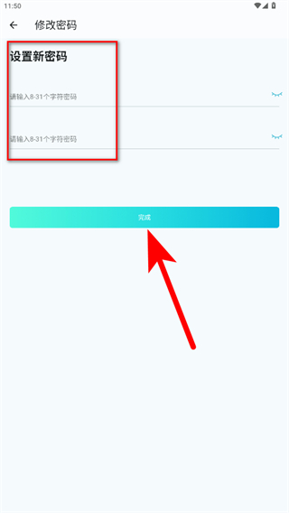 4、在密碼修改頁面中輸入8-31個字符的新密碼,再次確認后點擊完成,完成密碼修改操作。